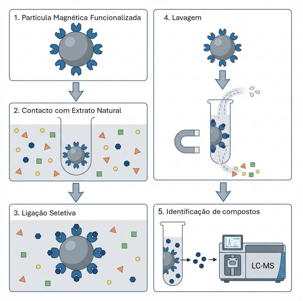 A edição de 22 de março do UAciência apresenta um artigo do investigador Gonçalo P. Rosa sobre o “Ligand fishing – quando a química aprende a pescar”, como abordagem inovadora na descoberta de moléculas bioativas em extratos naturais. O texto destaca as vantagens desta estratégia face aos métodos tradicionais e o seu potencial na valorização de recursos naturais.
